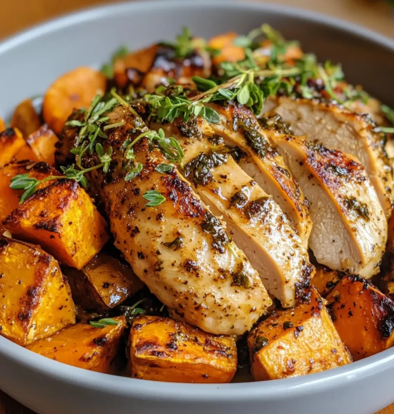 - Serviere das Hühnchen auf der Basis und füge die gerösteten Süßkartoffeln hinzu.