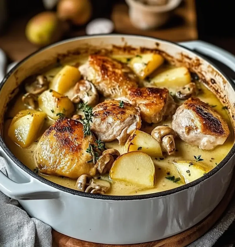 Dieses Gericht basiert auf Hühnerschenkeln und -keulen, die zuerst angebraten und dann in einer aromatischen Sauce aus Apfelwein, Hühnerbrühe, Gemüse und Speck geschmort werden. Die Sauce wird zum Schluss mit Sahne verfeinert, während Apfelspalten für frische, süße Akzente sorgen. Das Ergebnis: zartes Fleisch, eine samtige Sauce und ein Duft, der die ganze Küche erfüllt.