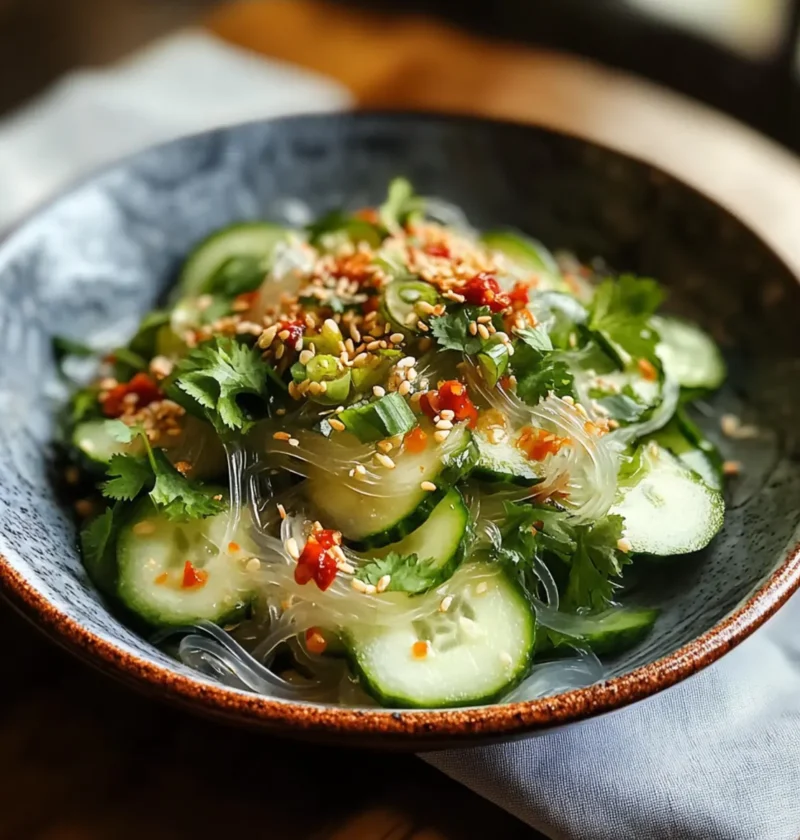 Probiere diesen kalten Gurken- und Glasnudelsalat aus und genieße die frischen, liebevoll kombinierten Aromen!