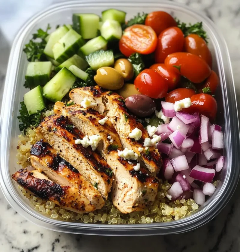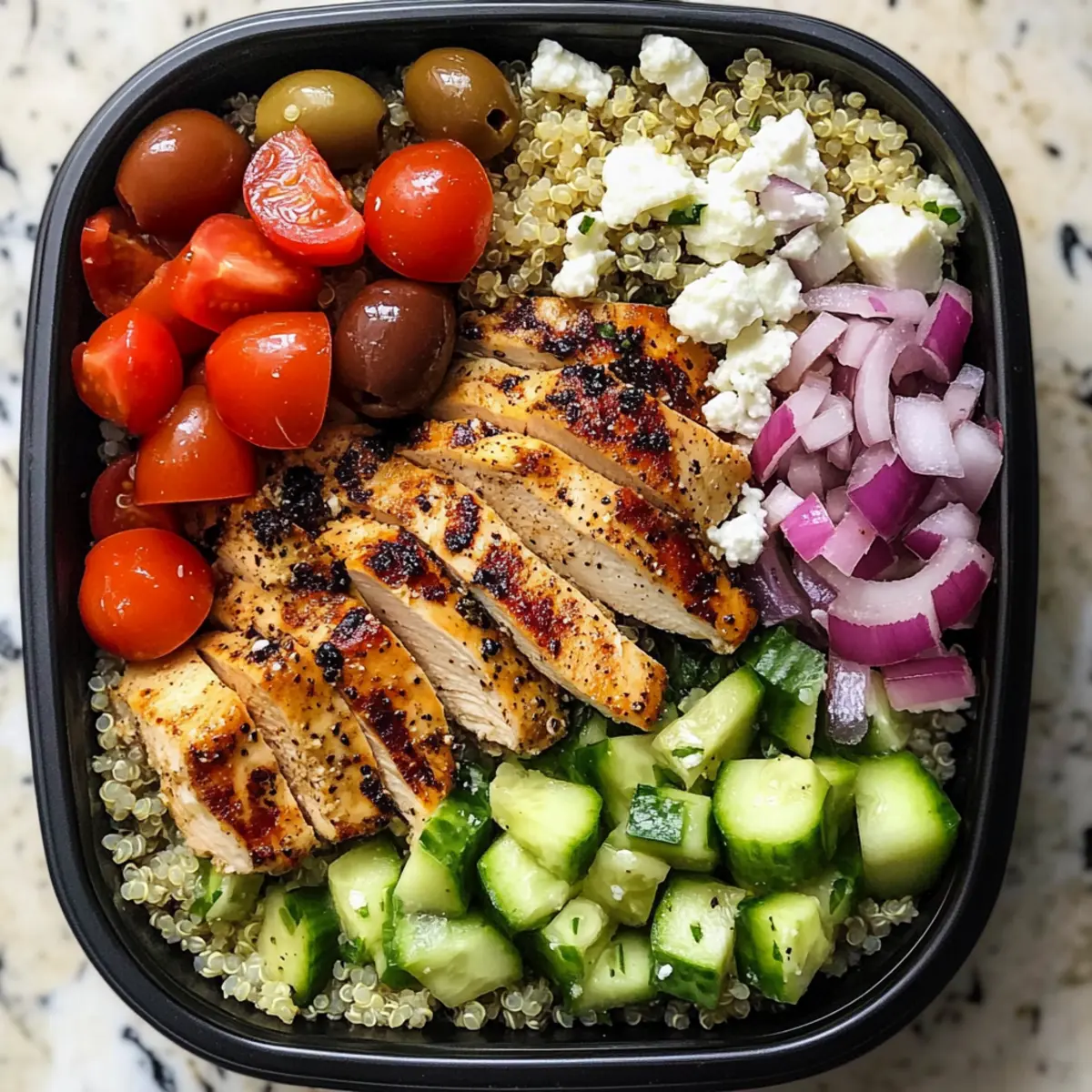 Nimm mehrere geeignete Behälter und beginne mit ½ Tasse der flauschigen Quinoa als Basis. Verteile die geschnittenen Hähnchenstücke gleichmäßig auf die Quinoa. Füge frisches Gemüse wie gewürfelte Tomaten, Gurken und Zwiebeln hinzu, um eine ansprechende Schichtung zu erzielen. Garniere die Schalen mit zerbröckeltem Feta-Käse und ein paar Oliven für zusätzlichen Geschmack.