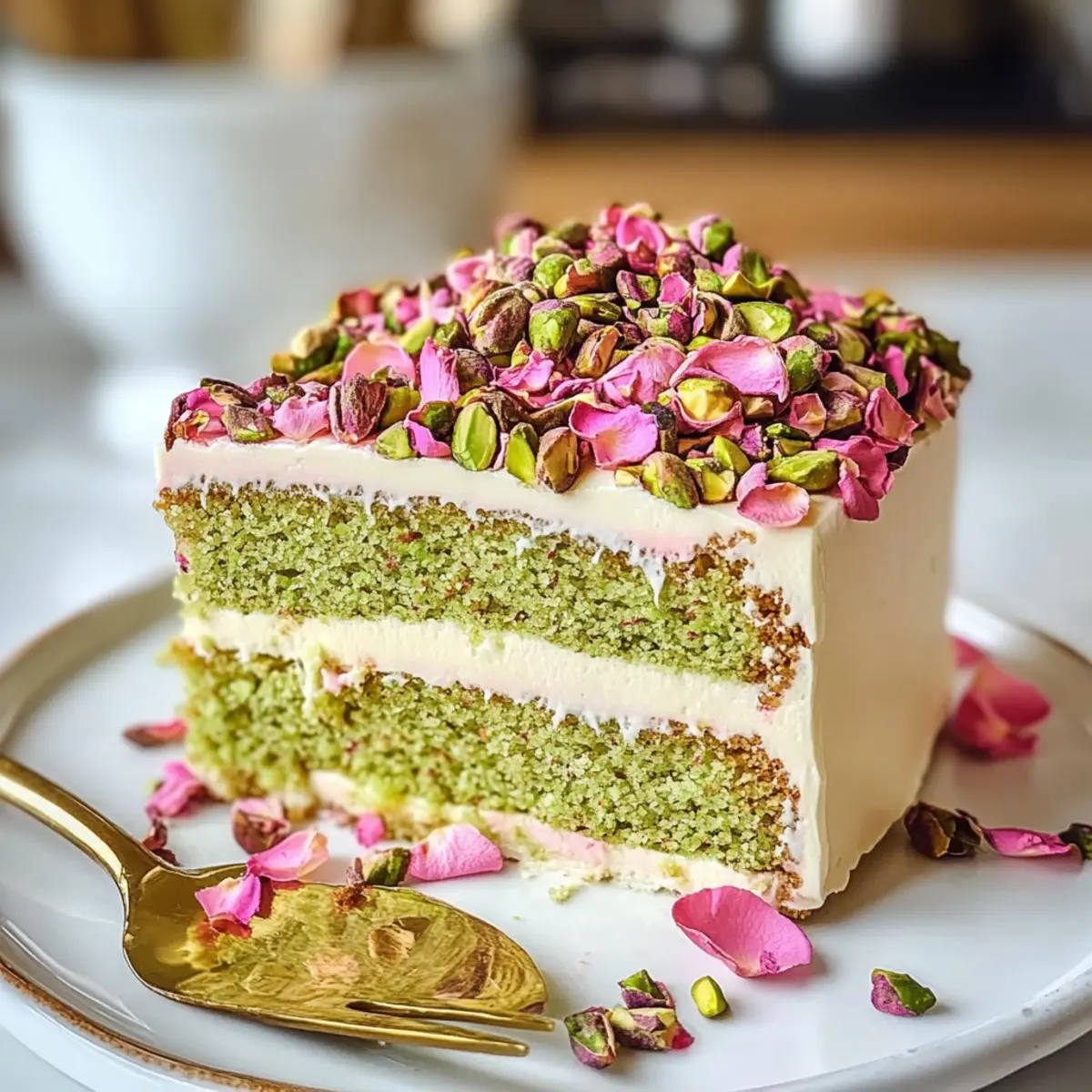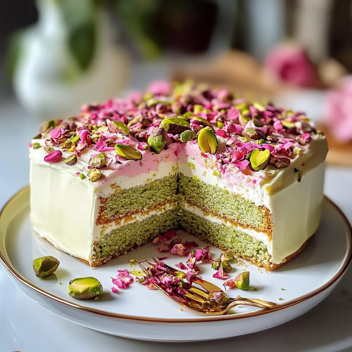 Schöne Präsentation: Mit der Dekoration aus Pistazien und essbaren Rosenblättern wird dein Kuchen nicht nur köstlich, sondern auch optisch ein Highlight auf jedem Tisch!