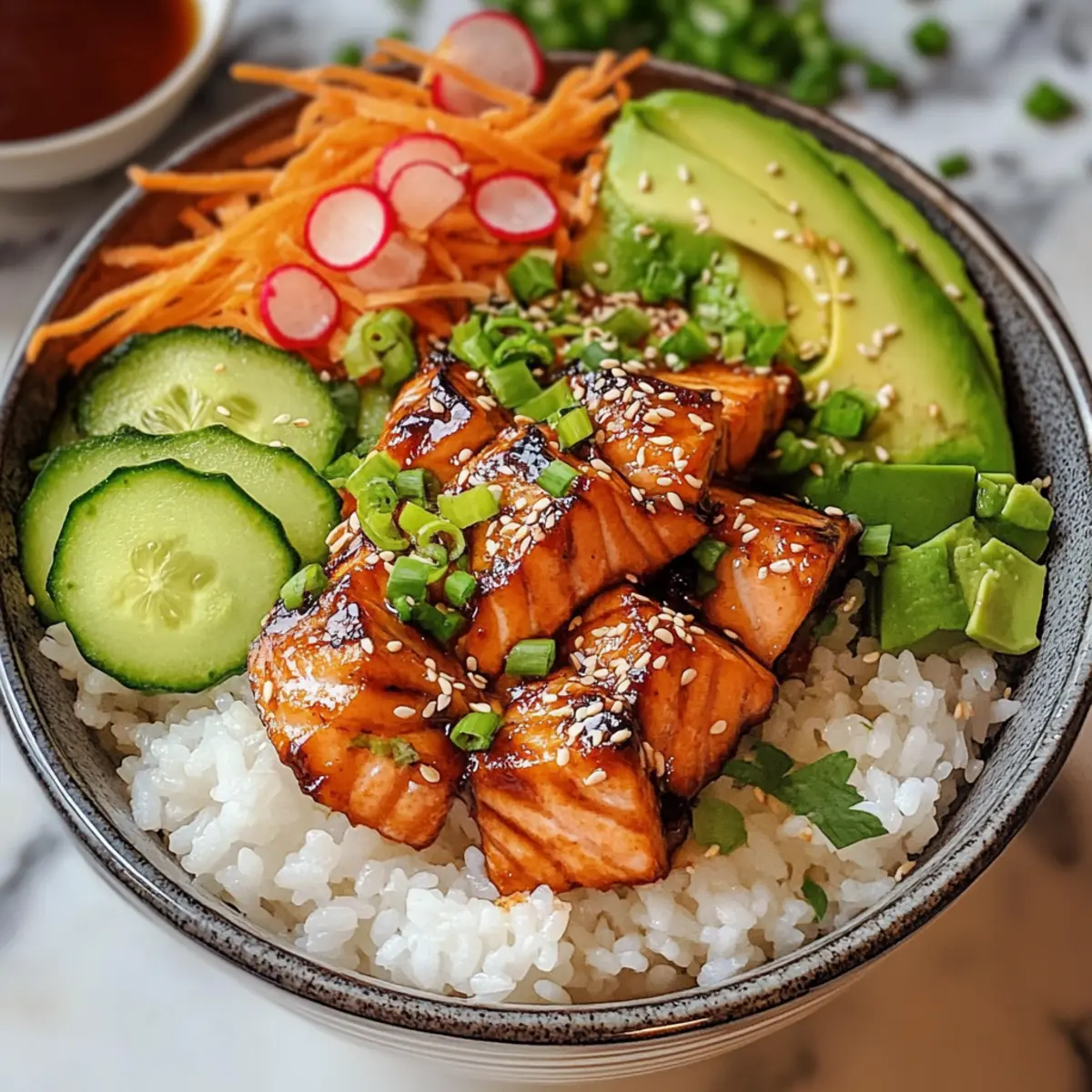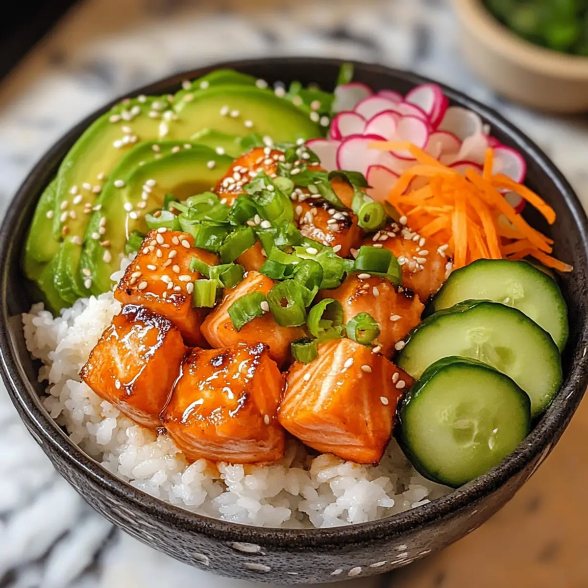 Verteile den gekochten Sushi-Reis gleichmäßig in Schalen. Schneide den abgekühlten Lachs in mundgerechte Stücke und platziere ihn auf dem Reis. Arrangiere die geschnittene Avocado, Gurke, Karotten, Radieschen und Frühlingszwiebeln kunstvoll um den Lachs. Das ergibt nicht nur ein schönes Bild, sondern sorgt auch für einen abwechslungsreichen Geschmack.
