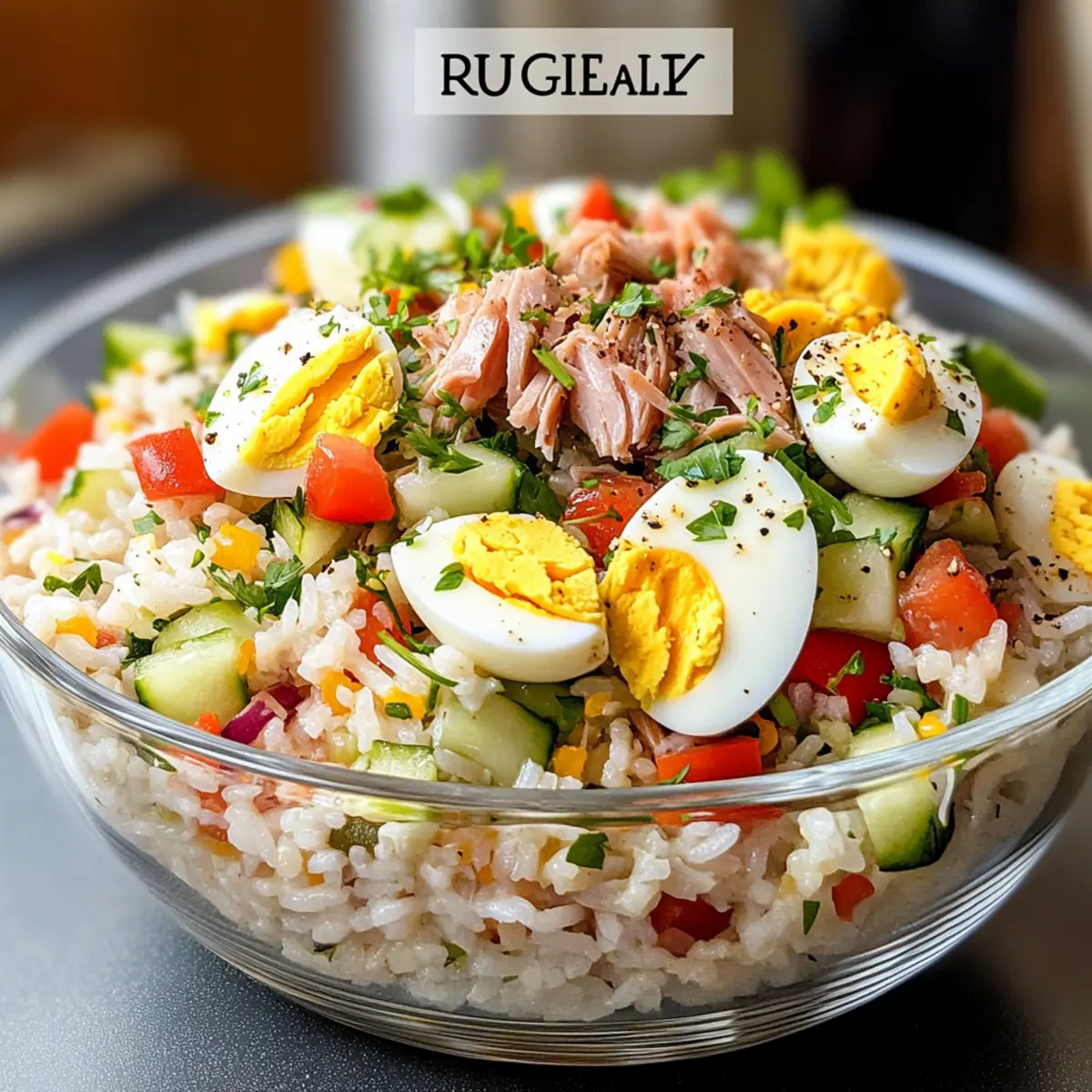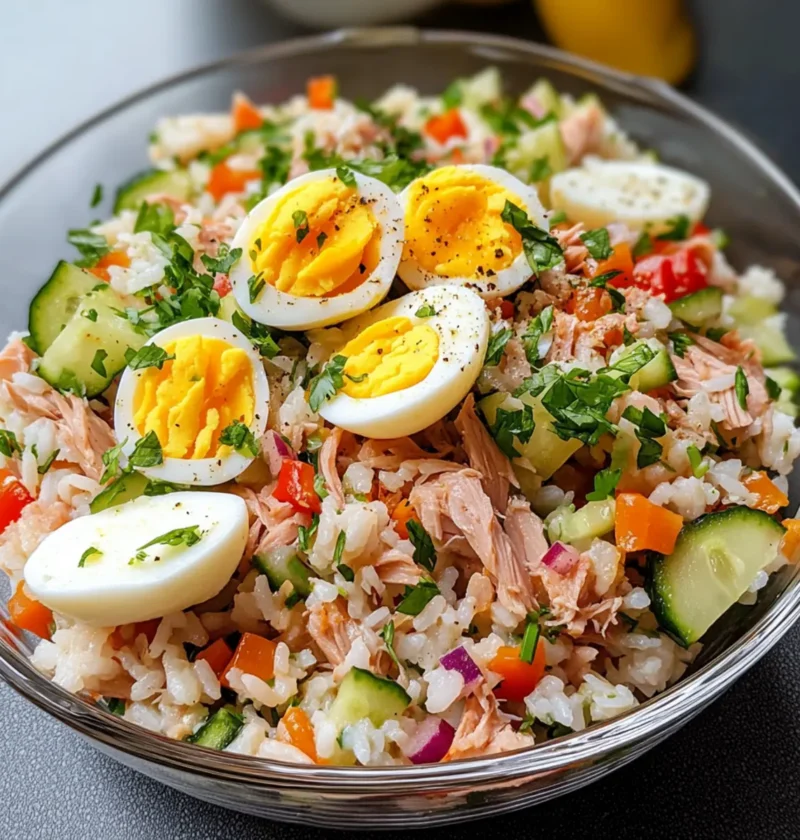 Für viele Menschen ist dieser Reissalat eine gesunde Option. Stelle sicher, dass du auf mögliche Allergien achtest, insbesondere wenn du Zutaten wie Thunfisch oder Eier verwendest. Für eine vegane Option kannst du den Thunfisch durch Kichererbsen ersetzen und die Eier weglassen. So kannst du das Gericht für alle anpassbar machen!