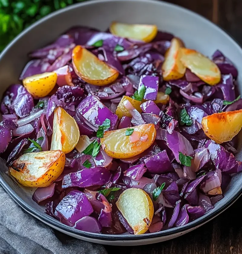 Dieses Gericht verbindet die leichte Süße und den milden Biss von Rotkohl mit der cremigen Textur der Kartoffeln. Durch das Anbraten von Zwiebeln und Knoblauch entsteht eine aromatische Basis, die den Rotkohl geschmacklich perfekt unterstützt. Wer möchte, kann optional noch Hähnchenschinken hinzufügen, um eine zusätzliche Proteinquelle zu integrieren. Mit frischer Petersilie garniert wird das Gericht nicht nur zum Gaumenschmaus, sondern auch zum Hingucker auf dem Teller.