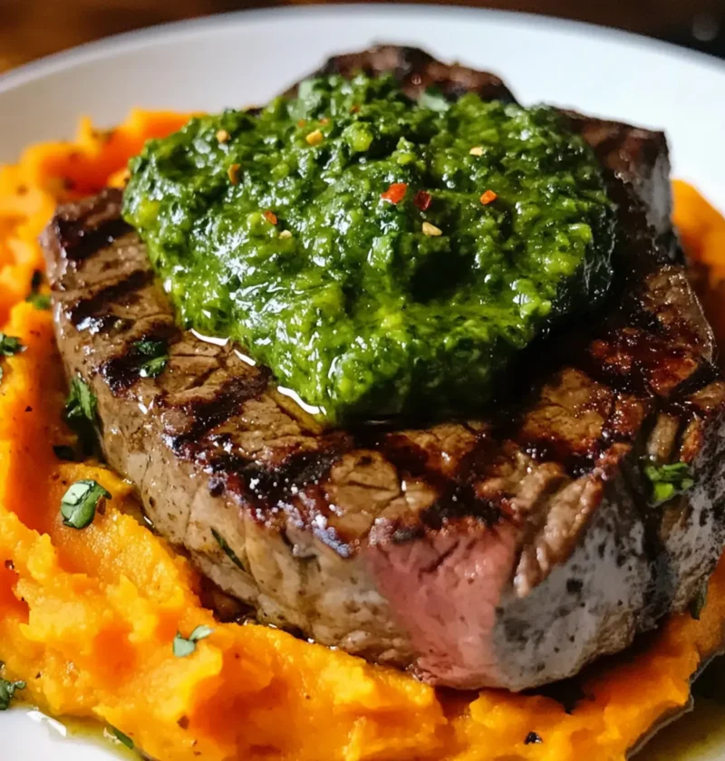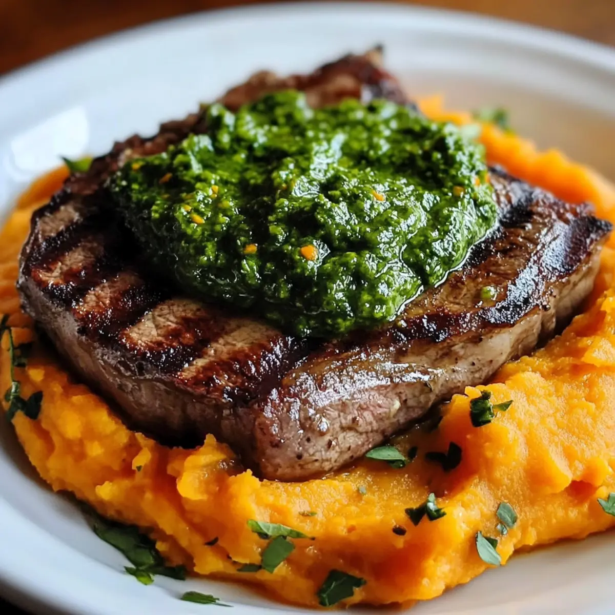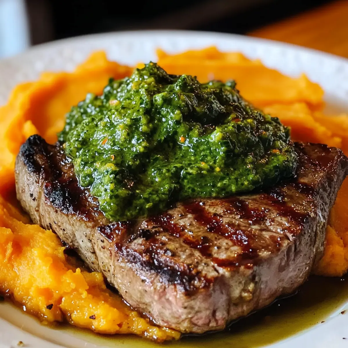 - Serviere die pürierten Süßkartoffeln mit dem Steak und der grünen Soße.